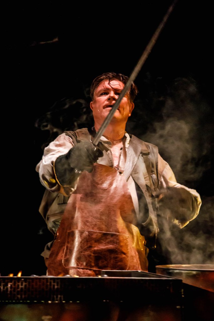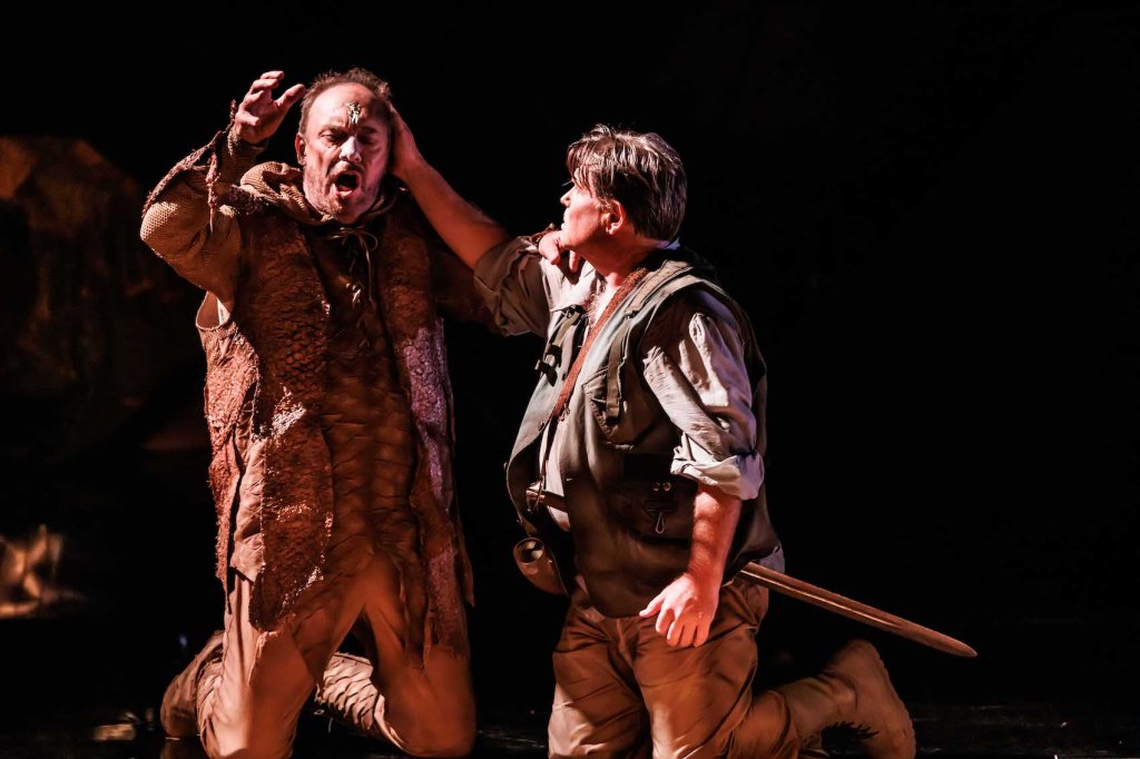 Daley’s heldentenor rings out true and clear, and he throws himself into the portrayal of impetuous, short-tempered, and ultimately heroic youth Siegfried. In line with Chaundy’s focus on the humanity of the characters, Daley strengthens the audience’s bond with Siegfried when he sits on the edge of the stage and exudes touching candour as he shares his deep wish to have known his parents. This humanist approach continues when Siegfried slays the dragon; the reason he comes to have dragon’s blood on his fingers is because of he showed tenderness and compassion towards the dying beast.