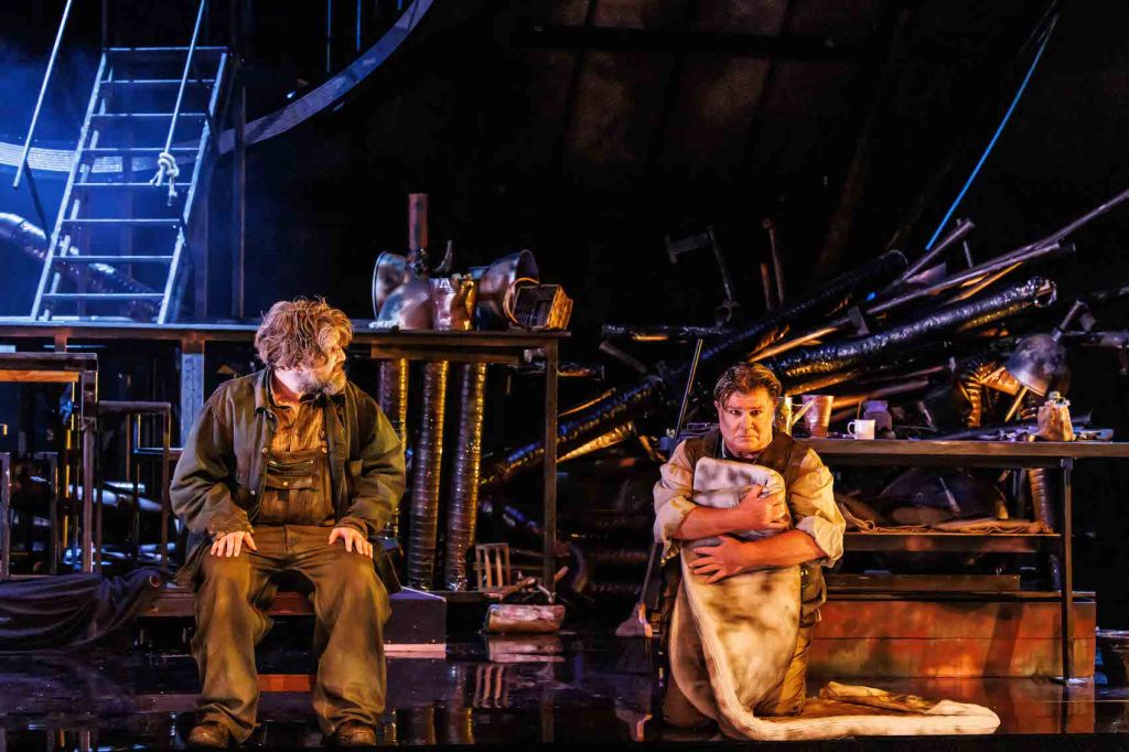 The chance to see the staging for Siegfried has been eagerly awaited and the dark details and multiple coups de theatre of Andrew Bailey’s set design do not disappoint. Sitting beneath the hinged stage floor, Mime’s home is richly detailed, with spaces for the smithing of swords (live fire and all) and the broiling of soups and potions. A metal staircase comes through the open overhead ring, allowing a grand entrance or exit to accompany the various leitmotifs.