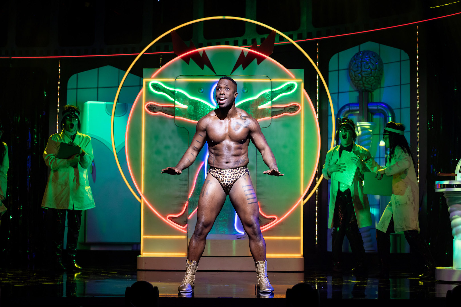 As Rocky Horror himself, it is a great asset to have an actual music theatre performer in the role; Loredo Malcolm skilfully makes Rocky much more than the usual hunky eye candy. Ellis Dolan brings raw vocal energy and ready charisma to the dual featured roles of Eddy and Dr Scott.