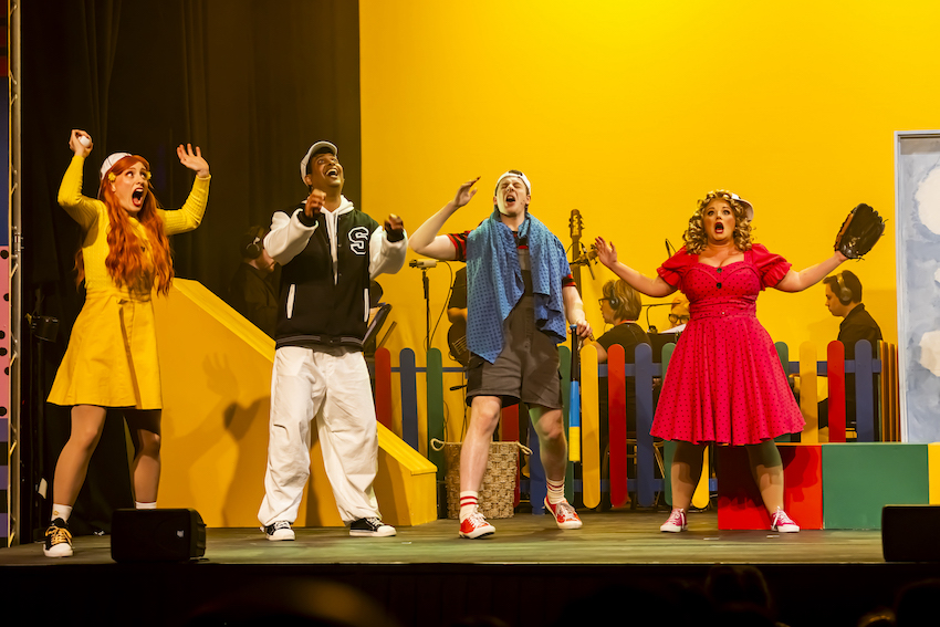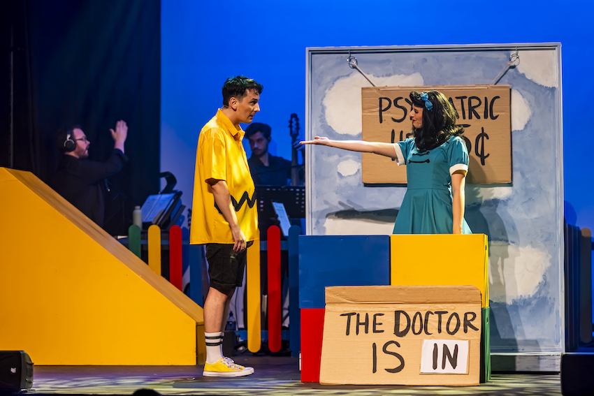 Costume design by Britni Leslie is completely authentic and visually appealing. Woodstock in yellow pinafore, skivvy, and beret is a fun highlight, and the wigs of Sally and Lucy are impressively perfect.