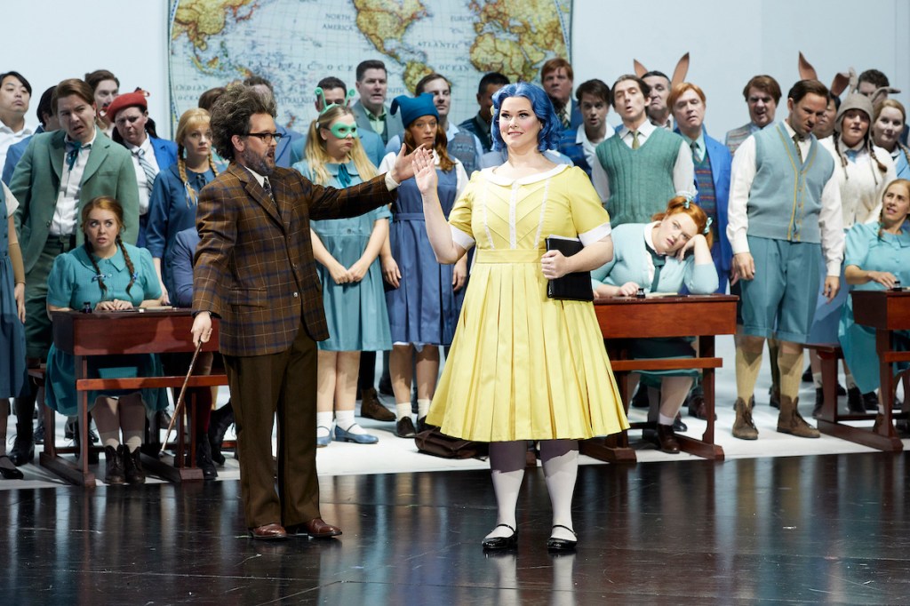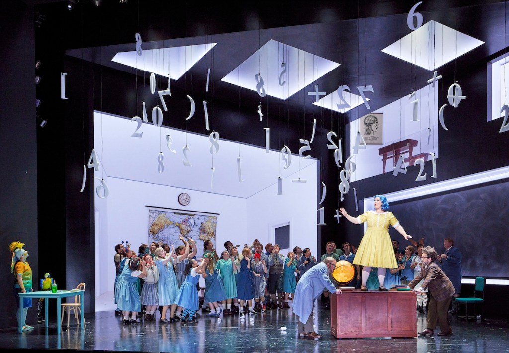 As the initial tavern scene dissolves to Olympia’s tale, the grey, dishevelled Hoffmann transforms back to a shy schoolboy with a crush on Olympia. More than just offering eyes and glasses, Coppelius brings a brain for the doll, which allows her to conjure an animated algebraic equation for the famous “Doll Aria,” pausing to make her calculations rather than to be rewound. As numbers begin to drop from overhead, the production makes one misfire in having the rambunctious schoolchildren move in a circuit around Olympia, their herd-like footsteps interfering with the glorious sound of a segment of this most iconic of arias.