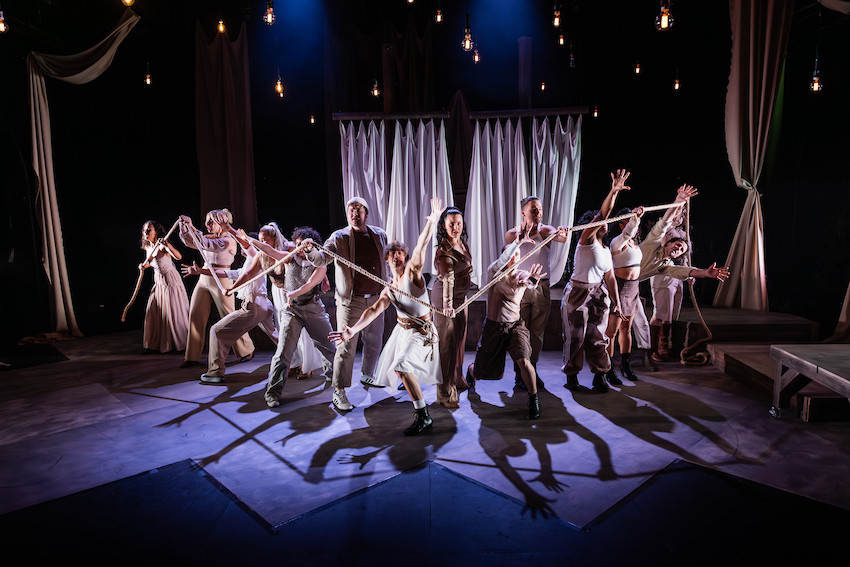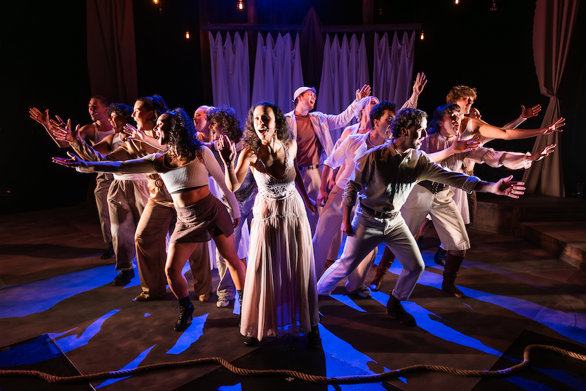 Taking inspiration from the second song, “On the Deck of a Spanish Sailing Ship, 1492” (in which passengers are literally en route to a new world), McKinnon sets the production on a ship-like set, with Curé often working the rigging or sail into the choreography. Emerging designers Harry Gill (set) and Sidney Younger (lighting) craft a visually appealing stage with various levels and movable pieces. Gill has a ceiling of warm glass globes overhead, and provides a memorable feature in “King of the World” when the storytelling is boosted with shadow-performers behind outstretched sails.