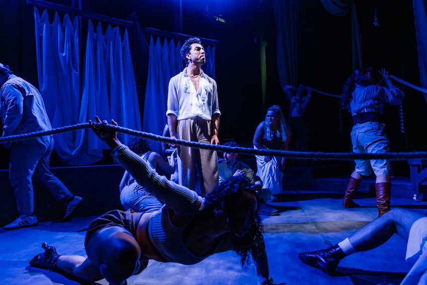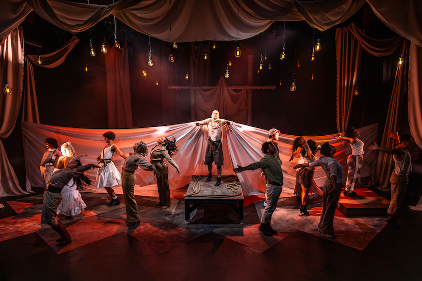 Taking inspiration from the second song, “On the Deck of a Spanish Sailing Ship, 1492” (in which passengers are literally en route to a new world), McKinnon sets the production on a ship-like set, with Curé often working the rigging or sail into the choreography. Emerging designers Harry Gill (set) and Sidney Younger (lighting) craft a visually appealing stage with various levels and movable pieces. Gill has a ceiling of warm glass globes overhead, and provides a memorable feature in “King of the World” when the storytelling is boosted with shadow-performers behind outstretched sails.