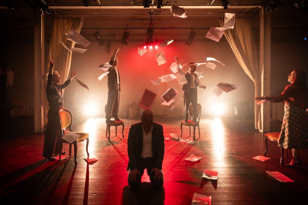 In an abstract setting by Mikailah Looker, the five singers uncover memories beneath dusty sheets in the atmospheric, warehouse-like space of fortyfivedownstairs. Parke interprets Finn’s musical tributes as a way to keep each person’s name alive, highlighting each mention with the projected name overhead. Martyn Coutts and Lara Gabor’s unobtrusive projection design also includes evocative black and white photos by Trent Parke.