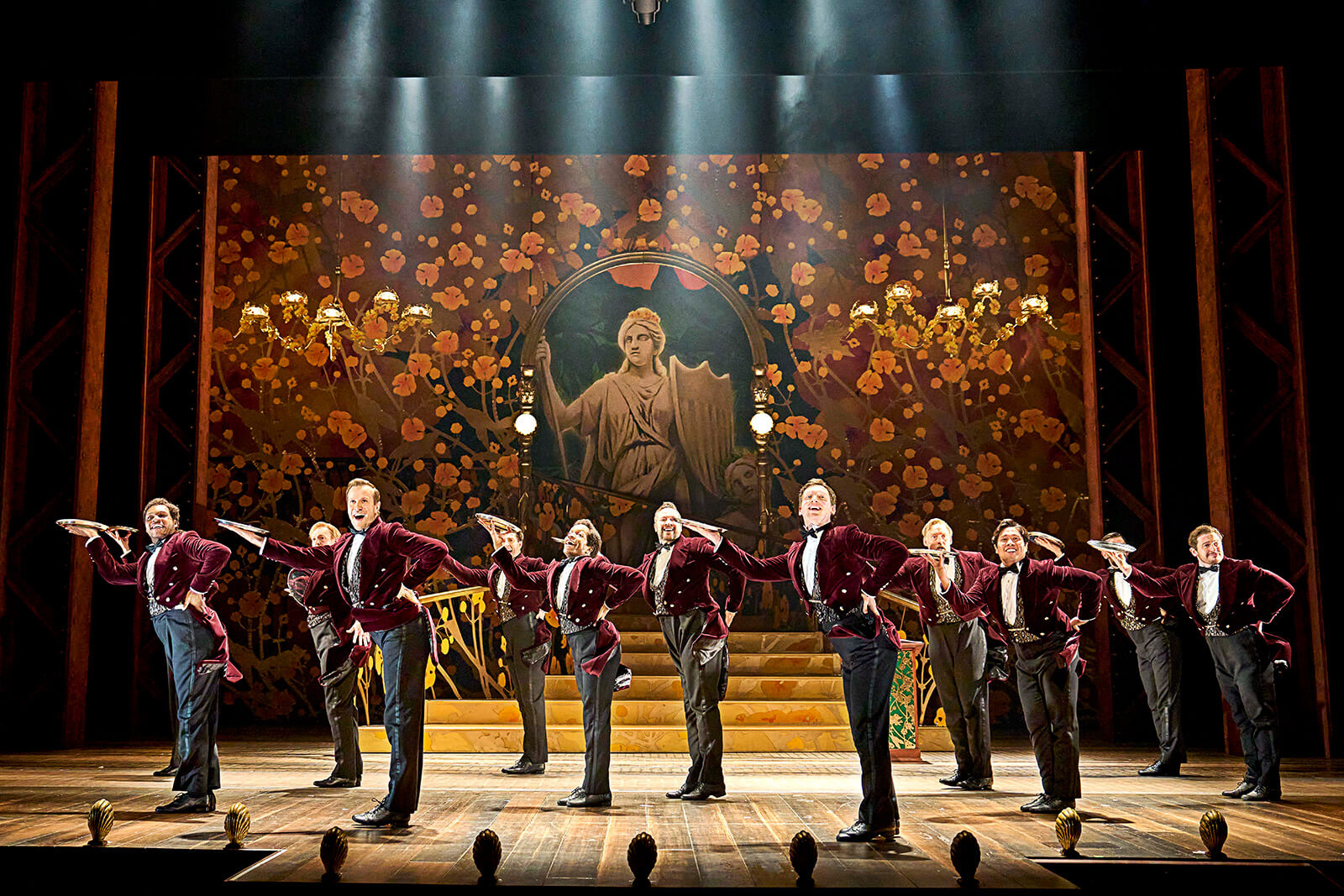 Director Dominic Cooke insightfully highlights the trepidation and joy of Dolly’s welcome return to society. A brief prologue sees Dolly carefully putting away her black dress, her year of mourning for her late husband Ephraim Levi now over. Offsetting the focus on financial security, the cut song “Love, Look in My Mind” is reinstated, this time in act two for a pensive moment as Dolly prepares to go back to Harmonia Gardens.