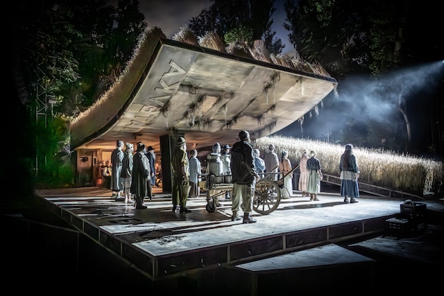 Designed with deceptive simplicity by Tom Scutt, the action unfolds on an orthogonal wooden floor with thatched overhead roof curved upwards. Giving a gently improvised feel, all scenes are created from some chairs and trestle tables. With no actual backdrops to change, scenes have room to breathe. The cast remaining on stage for much of the performance facilitates a ready flow and supports the improvised feel of a troupe of players working as one.