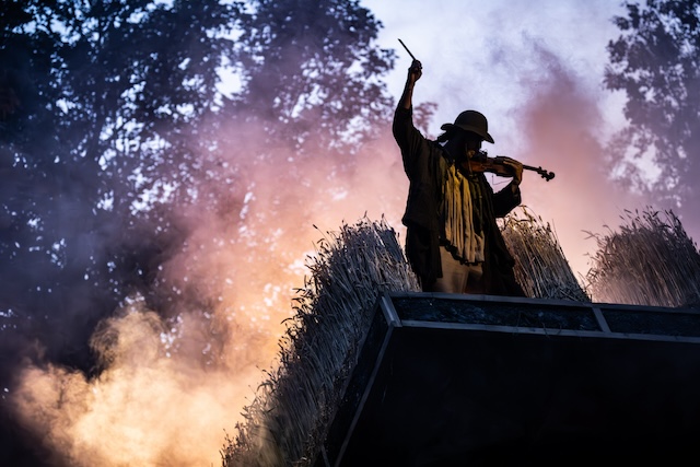 Such is the sense of realism and community that the violence of the pogrom is very upsetting. Being outdoors, the intruders at the wedding carry live flaming torches, ready to set houses and fields alight. On a prettier note, cast members carry live candles for “Sunrise, Sunset” for a beautiful stage picture.
