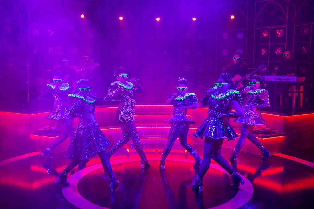 Lighting design of Tim Deiling is a key aspect of the visual appeal of Six the Musical, with the distinctive costumes of Gabriella Slade adding dazzling spectacle of their own.