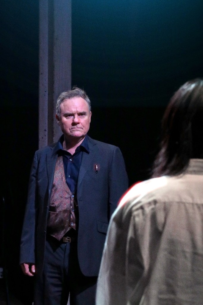 Tait Adams provides modern day costumes without any particular nods to extremes of fashion. Having new regent Claudius in a business suit gives him the vibe of a king of industry, his wedding reception to his brother’s widow Gertrude having the vibe of a scene from Succession.