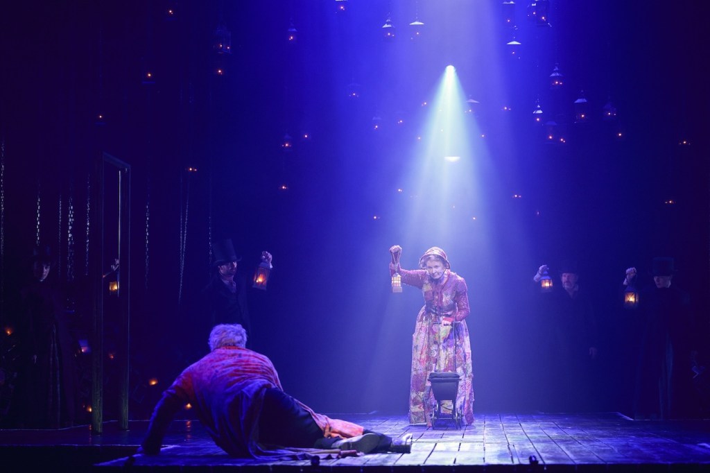 Howell’s scenic design is inextricably linked with the stunning lighting design of Hugh Vanstone, with dozens of magical flickering lanterns floating overhead up into the auditorium, more lanterns piled up on stage, and ominous glowing light seeping up below the floorboards of Scrooge’s office. Lighting aids the magical appearance and disappearance of spirits, also serving to create a warm Victorian glow.