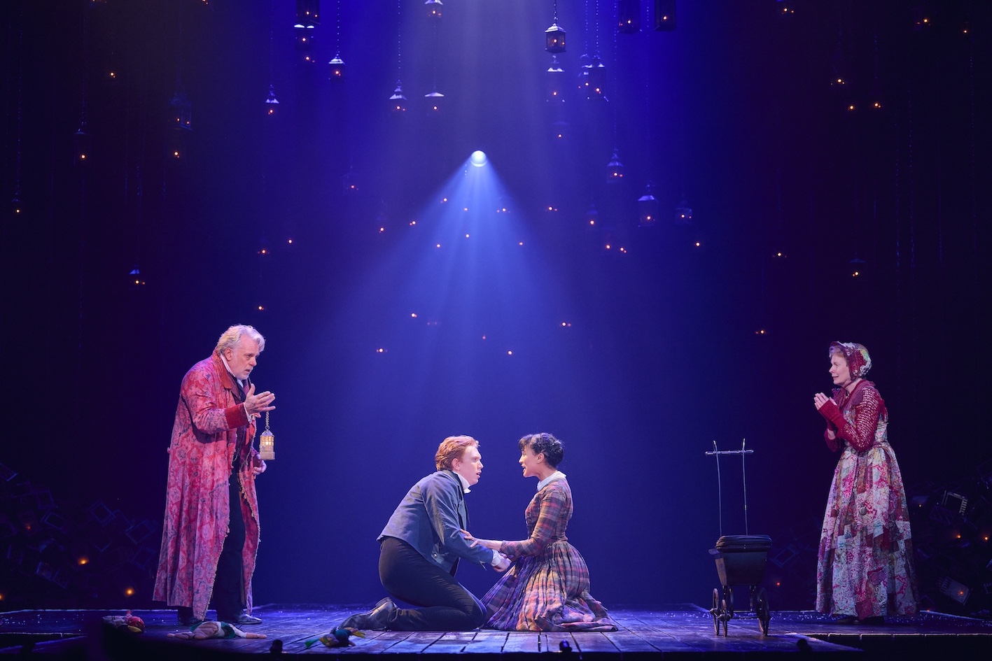 Howell’s scenic design is inextricably linked with the stunning lighting design of Hugh Vanstone, with dozens of magical flickering lanterns floating overhead up into the auditorium, more lanterns piled up on stage, and ominous glowing light seeping up below the floorboards of Scrooge’s office. Lighting aids the magical appearance and disappearance of spirits, also serving to create a warm Victorian glow.