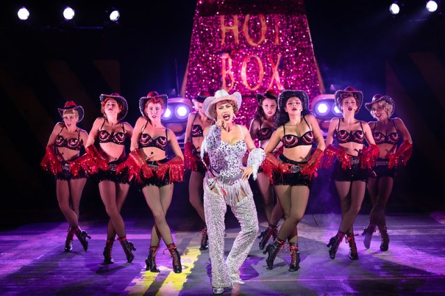 Costume designer Jennifer Irwin has a keen eye for period detail as she outfits the company in vibrant Technicolor tones, like an MGM movie musical on the stage. Putting Sky Masterson in a sky blue suit is a deliciously witty touch. Hot Box costumes are glitzier than usual but this clearly fits the outsized production.