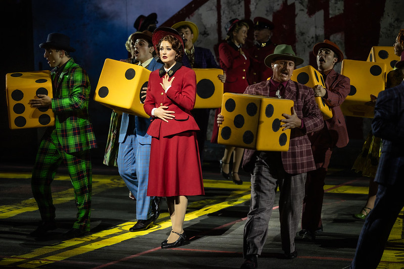 Evergreen Broadway Golden Age classic Guys and Dolls flourishes with the super-sized outdoor Handa Opera treatment, the glittering Sydney skyline a worthy stand-in for New York City itself.