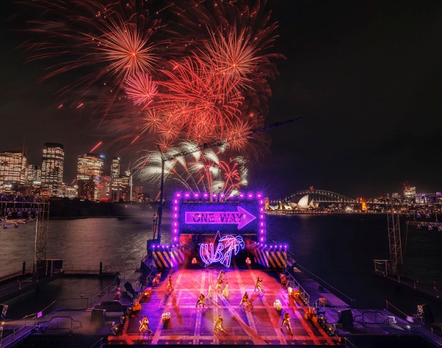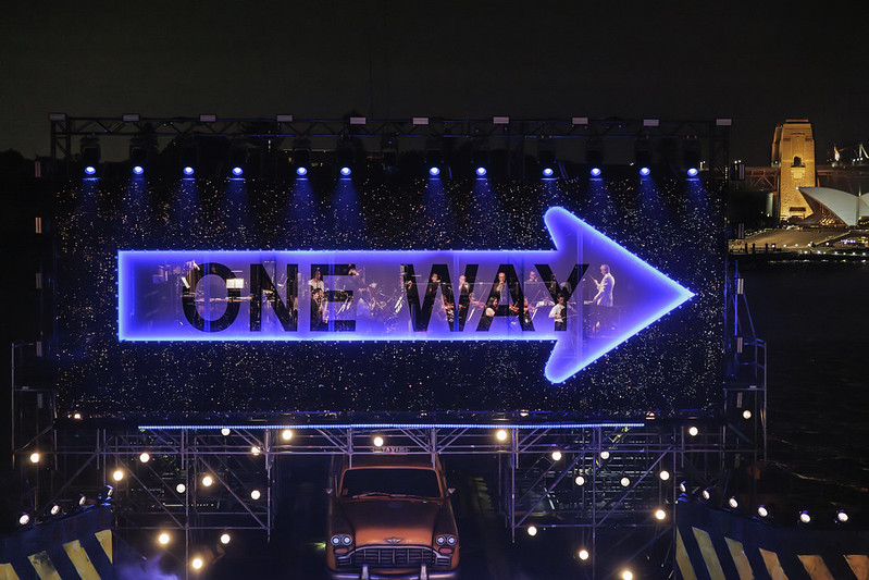 Thomson’s work is intrinsically linked to that of lighting designer Bruno Poet, who frames the stage with coloured lights around a massive ONE WAY sign. Poet transforms the stage into purples and green for the tropical Havana jaunt, capped off by a giant neon Cuba sign flown in by crane.