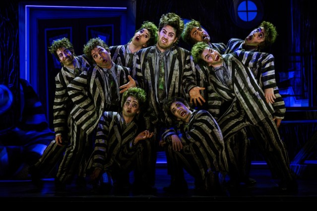 Instantly accessible, Perfect’s music is filled with jaunty earworms (not to be confused with sandworms). Beetlejuice introduces the musical in devilish style with “The Whole Being Dead Thing.” Comic mania hits a high with act two charm song “That Beautiful Sound,” later topped again with game show company number “Creepy Old Guy.”