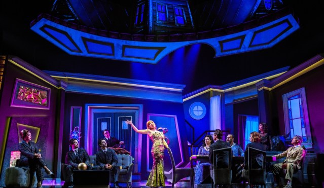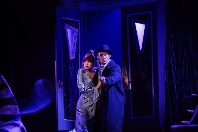 Costumes by William Ivey Long are reliably characterful, eye-popping, and glamorous. Not using a single set of parallel lines, scenic designer David Korins crafts the haunted house as the physical embodiment of the story’s zaniness. Over and above all creative elements, the lighting design of Kenneth Posner is a star attraction in its own right, achieving extraordinary results in literally painting the stage in vivid colour and framing the action in sparkling glitter.
