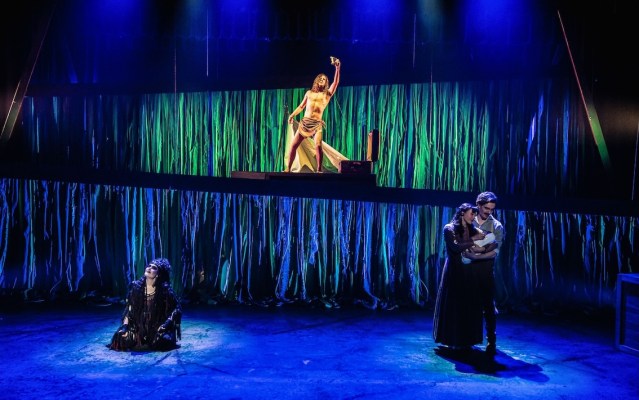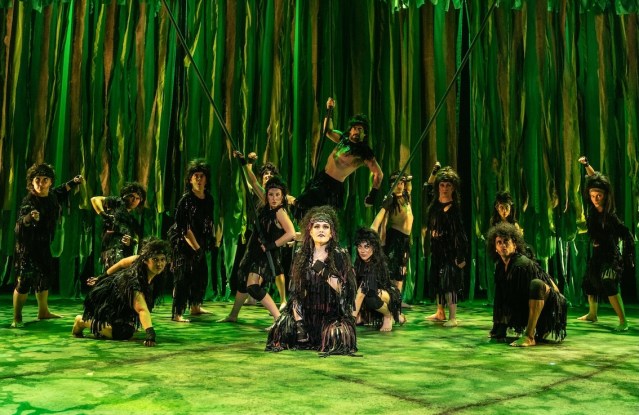 There is strong visual synergy between the work of set designer Jacob Battista and costume designer Bianca Pardo. Battista represents hanging vines with long strips of fabric while Pardo adorns the gorilla suits with strips of black fabric, which swing fabulously during dance sequences. Battista frames the stage with remnants of the shipwreck, working with skilful lighting designer Declan O’Neill to create varying locations and atmospheres as the sets of vines rise and fall.
