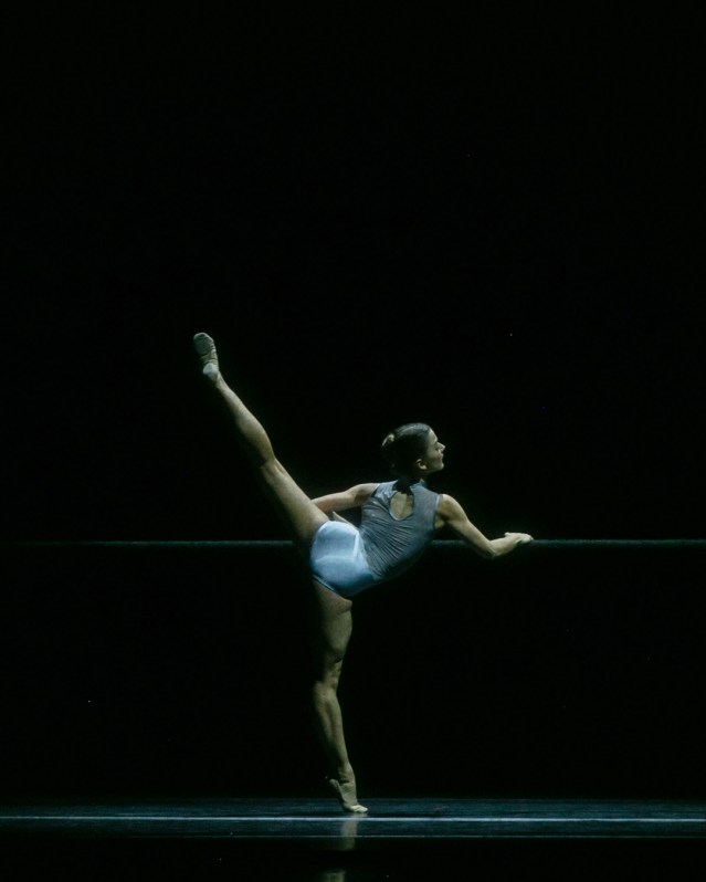 Forsythe himself designed the rather underwhelming black costumes and black staging, which simply involves rear curtains parting to reveal a barre. In one odd sequence, the front curtain is closed and four screens each show an anonymous pair of hands “dancing” at a barre.