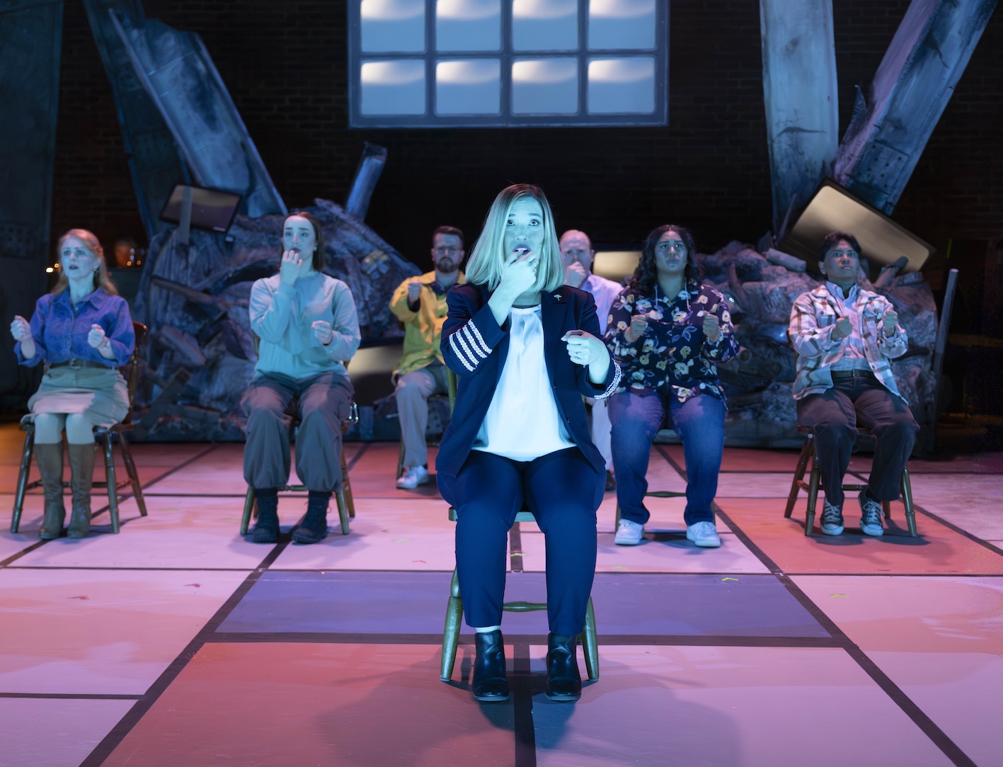 Also acting as choreographer, Wills uses chairs and two mobile stair units to create a plethora of locations including buses and planes. An overhead bank of television units displays atmospheric visuals, designed by Chris Anderson, as well as displaying a live feed from rookie reporter Janice. There is a moment when the newly arrived passengers first see the news and realise what has happened, but the production respectfully does not show actual news footage in this moment.
