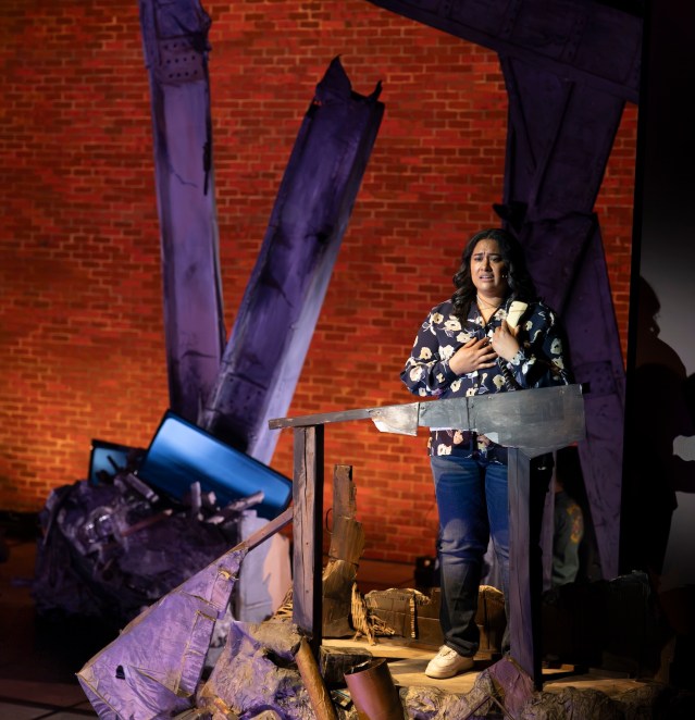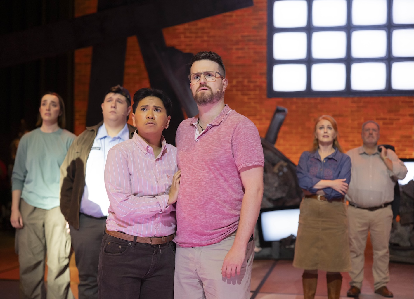 Working with set designer Merinda Gallagher, Wills has conceived a production where the joyful musical plays out in the shadows of the wreckage of the World Trade Centre. This vision reaches a brilliant and moving finale at the recreation of the donation of a piece of steel from one of the buildings to Gander.