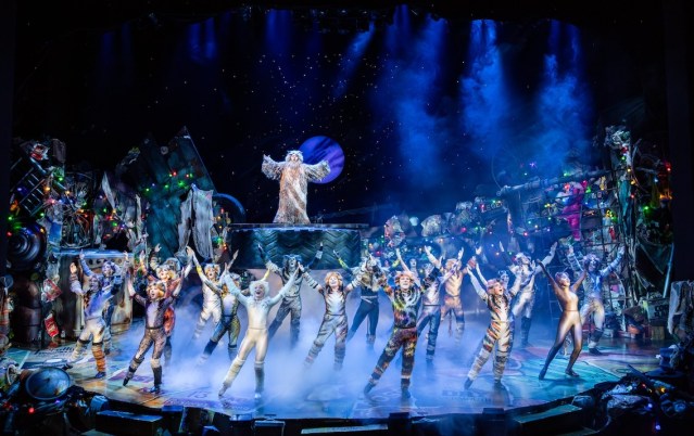 With the reopening of the State Theatre still many months away, Cats takes up residence in Hamer Hall, where its wide open stage is a surprisingly good fit. While Broadway is about to host the new high concept “Ballroom” version of Cats, this 40th anniversary season is, of course, aligned with the original production, with the cats cavorting in an oversized garbage dump. John Napier’s time-honoured original design remains impactful, especially as decorated by festoons of coloured globes as part of Howard Eaton’s enchanting lighting design.