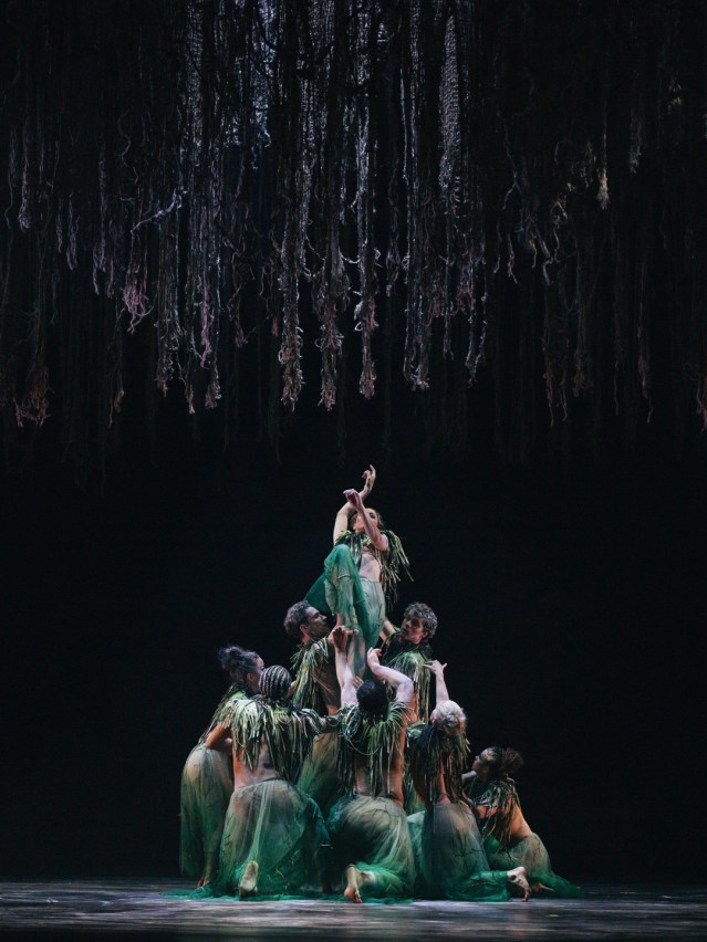 A particularly thrilling highlight of the dance staging comes early in the work. As part of the set design of Elizabeth Gadsby, a large bank of sleeping yams hangs overheard. Movement is seen and it is soon realised that there are dancers (gamely) hanging upside down amidst the yams. The dancers are gently lowered, artfully unfurling and connecting to show the miracle of plant life at work.