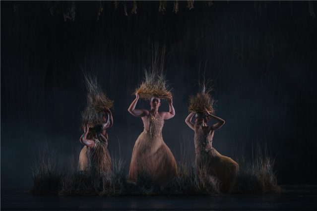 Notable solo pieces in Flora include a soulful, sinuous Yams Solo by Callum Linnane, the hardy Single Thread Solo by Kassidy Waters, and the heroic Knowledge Holder Solo of Kallum Goolagong. Elijah Trevitt makes a memorably dramatic impact as the Fire Spirit. Most striking is the work of Jill Ogai in the Golden Wattle Solo; dressed in black, Ogai palpably gives representation of the depth of unspeakable pain of an entire people ignored by the body governing the country where they live.